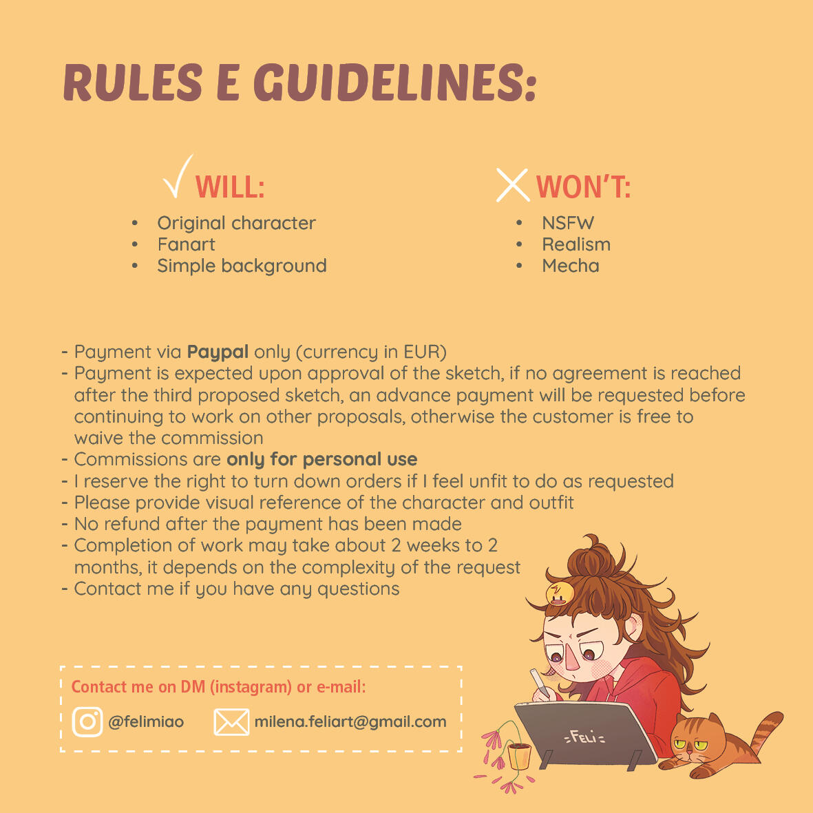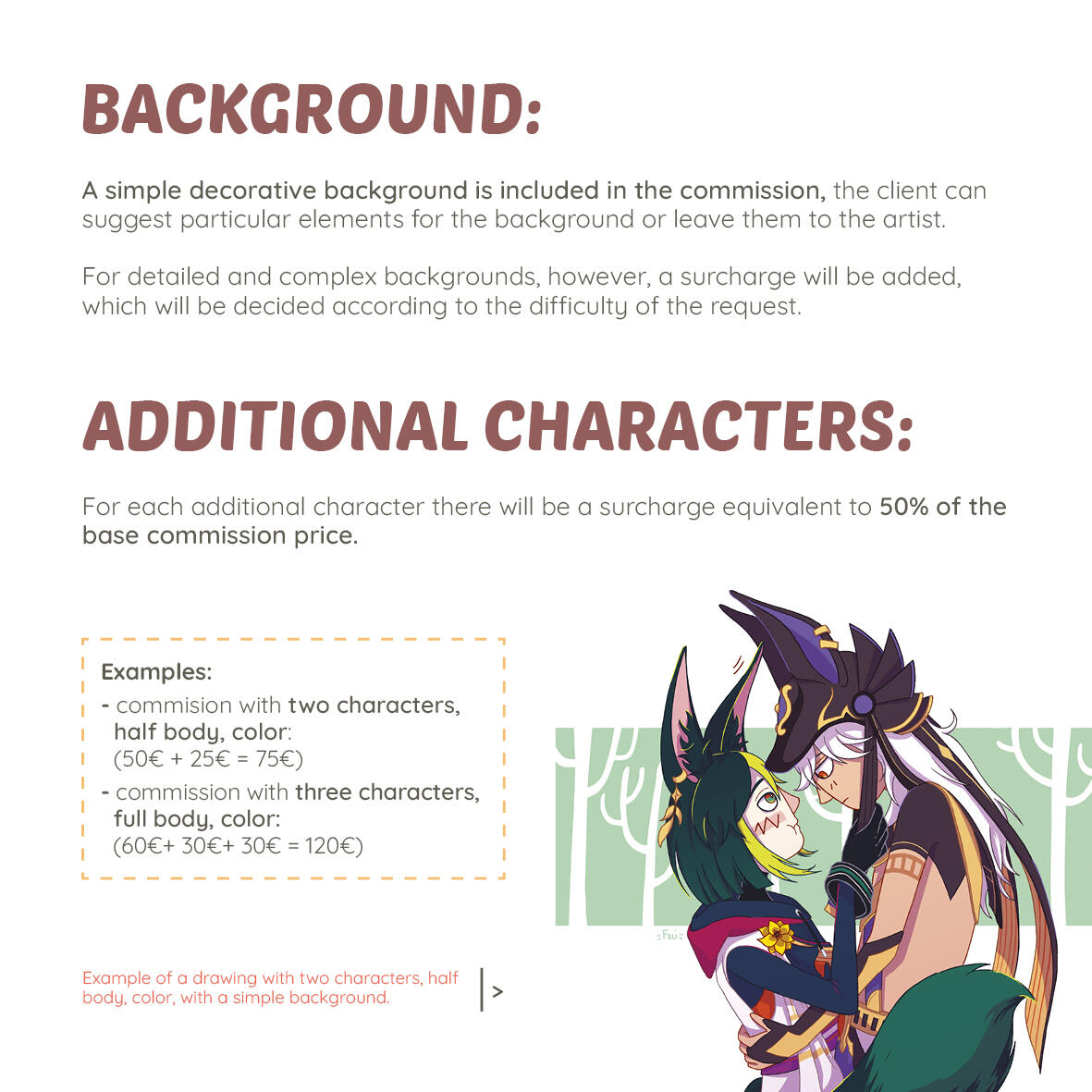 Per sfondi complessi invece verrà aggiunto un sovraprezzo da decidere in base alla difficoltà della richiesta.PERSONAGGI AGGIUNTIVI:Ogni personaggio aggiuntivo avrà un sovraprezzo equivalente al 50% del prezzo di base della commissione.